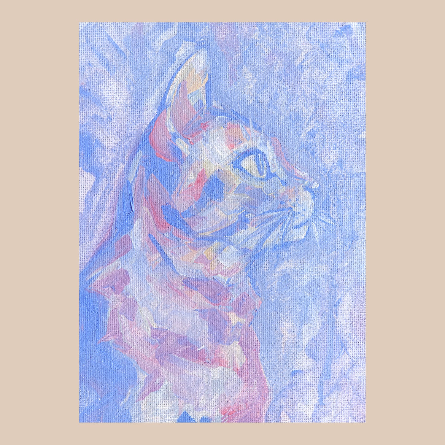 This original 18x24 oil painting features a contemplative cat in profile, gazing softly beyond the frame. Rendered with striking detail, the feline subject showcases pointed ears, luminous eyes, and delicate whiskers in the most pawfect pose. The dreamy composition flows with Van Gogh-inspired brushstrokes in blues, purples, and warm reds, accented by gentle hints of creamy yellow. A one-of-a-kind artwork on linen canvas board that brings artistic soul and gentle charm to any room.