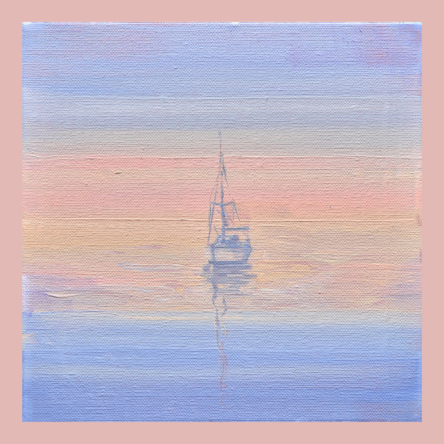 Discover a moment of pure serenity in this original oil painting. A graceful yacht floats centred on the canvas, gliding through waters so calm they seem to hold their breath. Soft peachy-pink tones radiate from the horizon, gradually deepening into cool purple-blue across the sky and water. Painted on a 20x20cm linen canvas board, this intimate work captures the essence of stillness—no wind, no waves, just peaceful silence. Hang it where you need a gentle reminder to slow down and find your own quiet space.