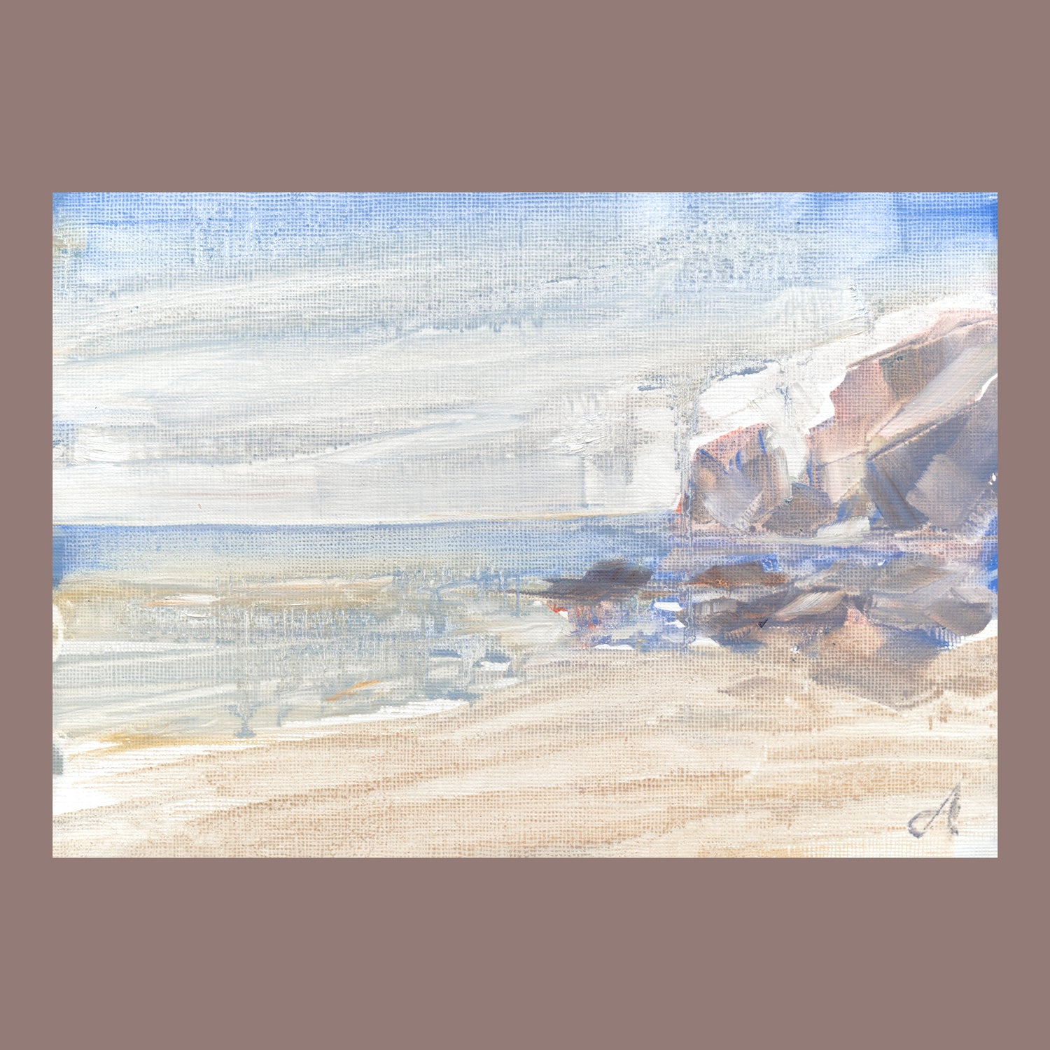 Experience the beauty of Cornwall with this original A5 oil painting of a serene beach. The smooth sandy foreground, wispy blue sky, and stirring water will transport you to the peacefulness of the coast. Admire the bold rocky outcrops and escape to your own Cornish retreat.