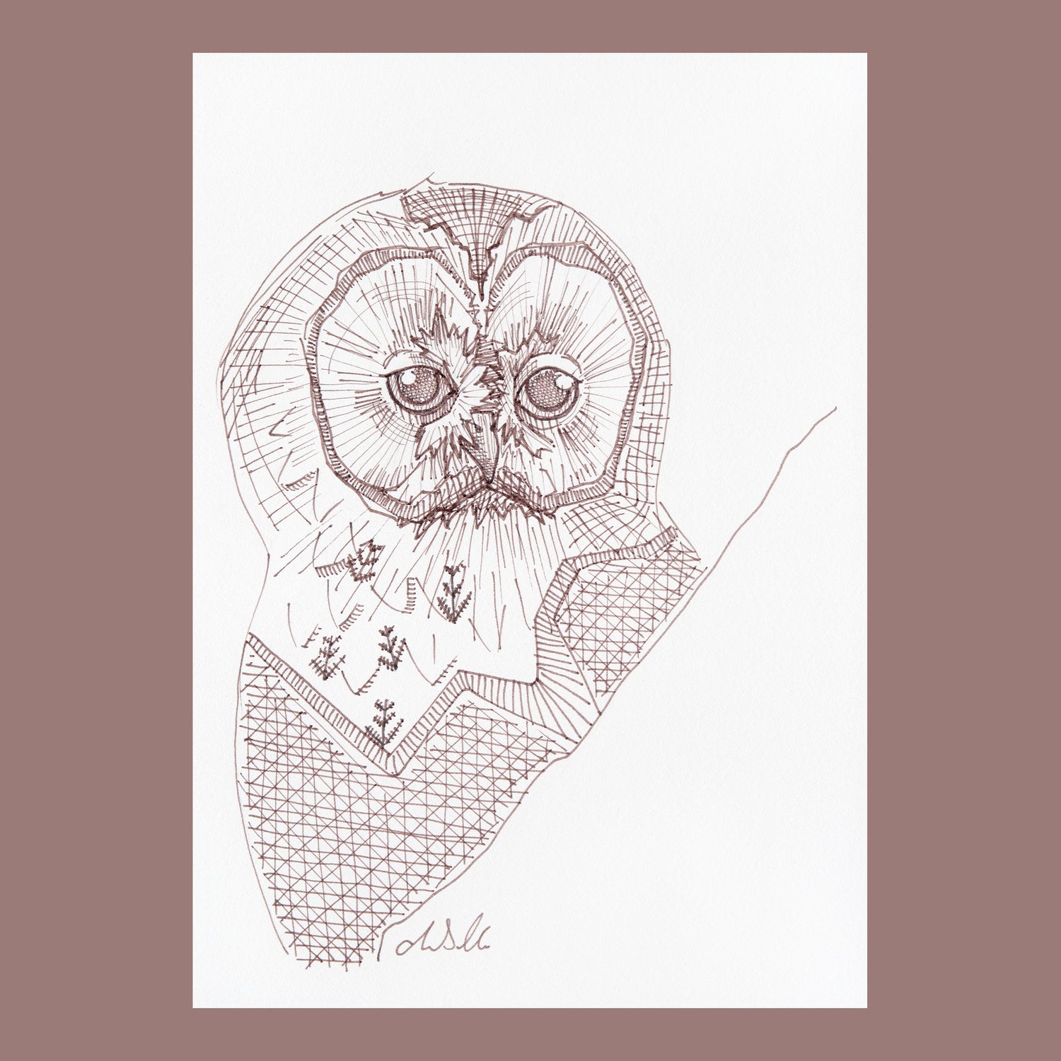 An original A5 Ink Drawing on Paper of a neutral, brown owl peeking from cover, neutral, almost unimpressed. The style is hatched, with many lines, and emphasis on the owl's radiant lines surrounding each eye.