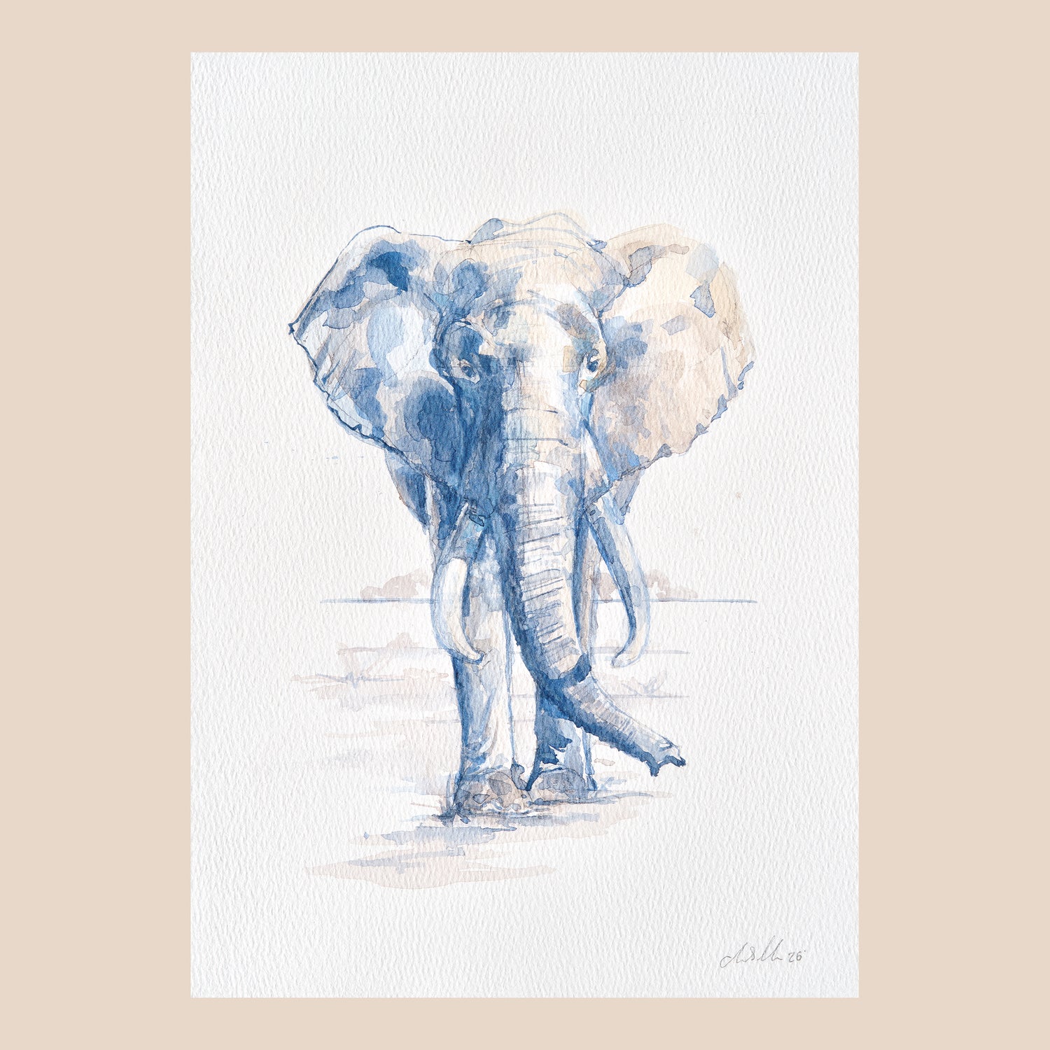 An original A4 watercolour painting on paper of a large African Bush Elephant, mid-gait on a steady stroll towards the viewer. Calm and composed, this painting is soft in it's palette and soothing in composition. Elephants are a first-choice to paint, and always a staple subject. This particular piece was painted as a part of an online tutorial session for Little People UK.