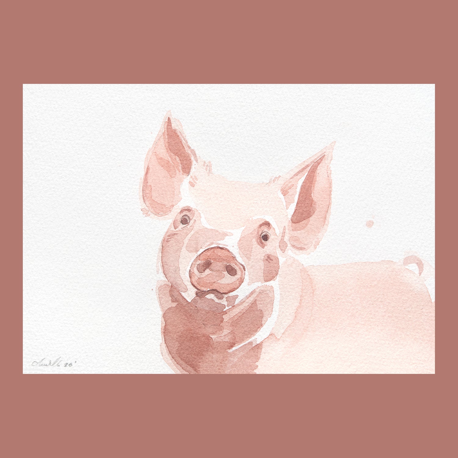 An original A5 watercolour painting on paper of a perky pig ready for the day.