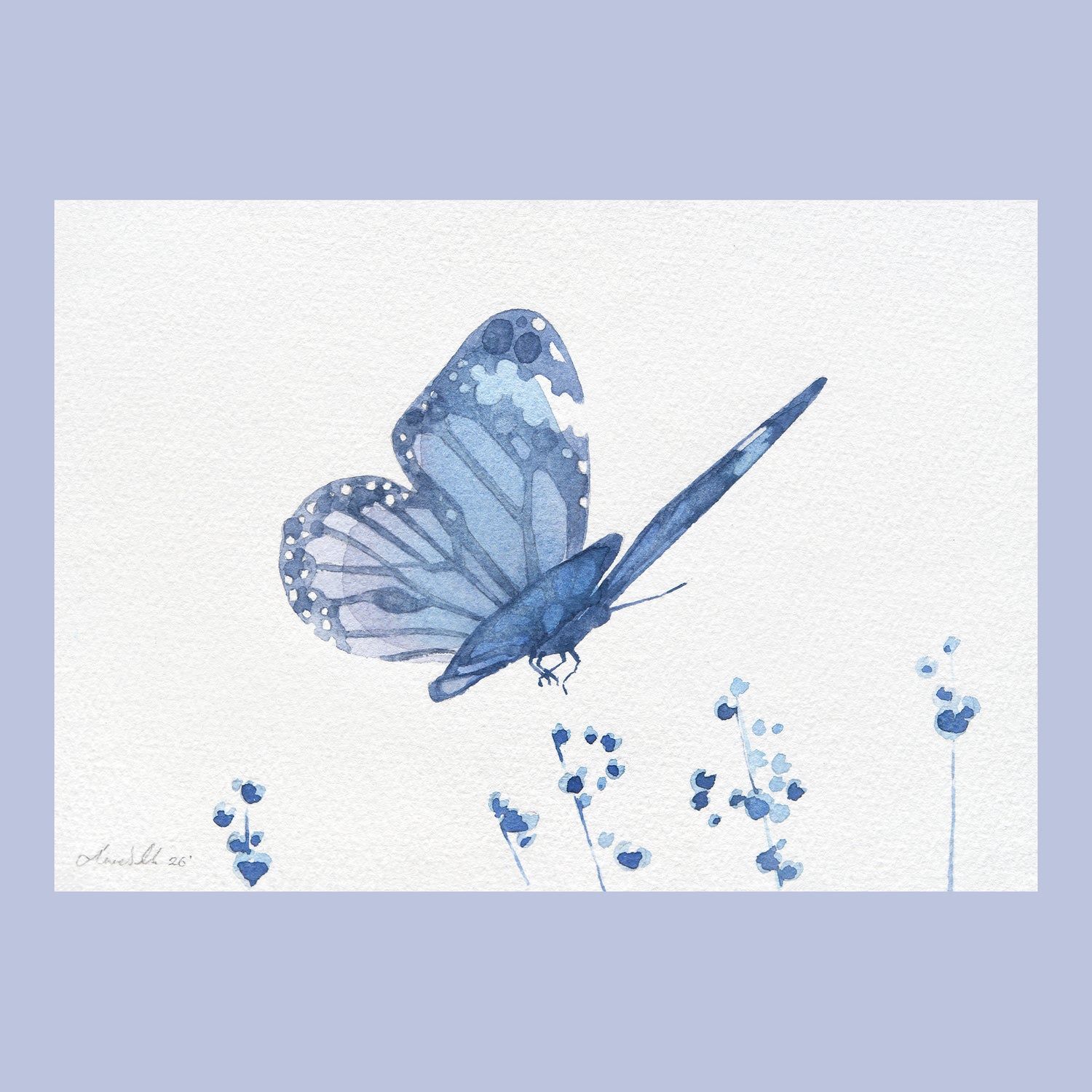 An original A5 watercolour painting on paper of a butterfly, wings mid-motion, on approach to a meadow of flowers,